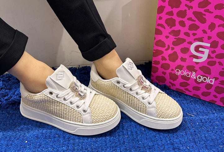 Sneakers donna gold&gold in ecopelle effetto raffia beige e inserti white. Linguetta logata, plantare estraibile in comfort foam. Chiusura con lacci piatti in cotone in tinta con applicazione charm passalacci removibili. Fondo gomma altezza 4 cm.