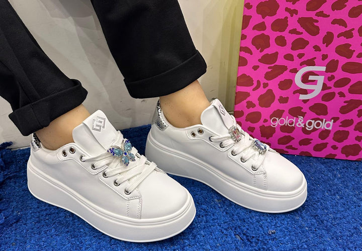 Sneakers donna gold&gold in ecopelle bianca. Linguetta logata e talloniera a contrasto. Plantare estraibile in comfort foam, chiusura con lacci piatti in cotone in tinta. Charm passalacci removibili in tinta con l'applicazione farfalla smaltata. Fondo gomma altezza 5 cm.