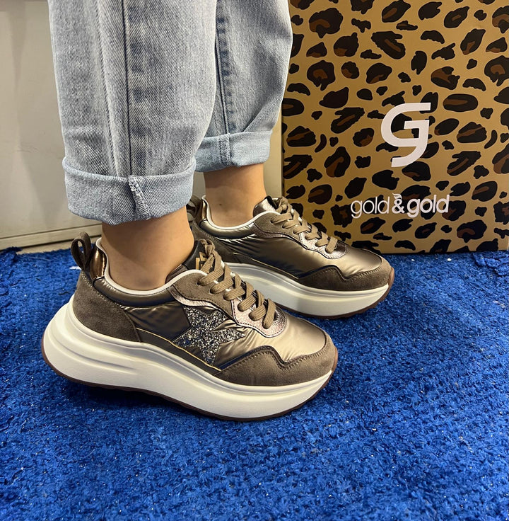 Sneakers donna gold&gold color tortora in tessuto tecnico e inserti in ecocamoscio. Linguetta logata e calzafacile posteriore. Plantare estraibile in comfort foam, chiusura con lacci piatti in cotone in tinta. Dettaglio stella glitter sul laterale, fondo sport in gomma altezza 4.5 cm