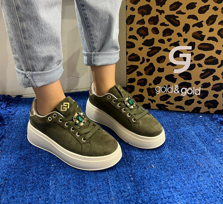 Sneakers donna gold&gold in ecocamoscio verde. Linguetta logata e talloniera effetto lamé a contrasto con logo. Plantare estraibile in comfort foam. Chiusura con lacci piatti in cotone in tinta con applicazione maxi charm passalacci removibile. Fondo gomma altezza 5 cm.