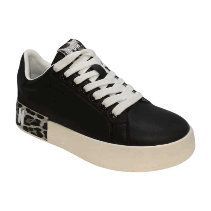 Sneakers donna Icon in ecopelle nera con inserti leopard in tinta. Talloniera e linguetta logate, chiusura con lacci piatti in cotone. Sottopiede morbido, fondo in gomma con logo a contrasto altezza 4 cm.