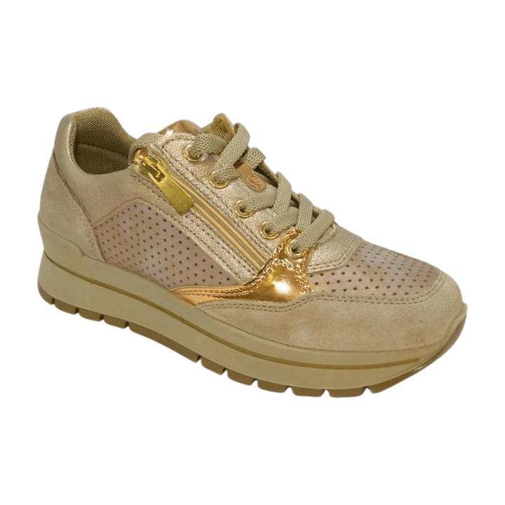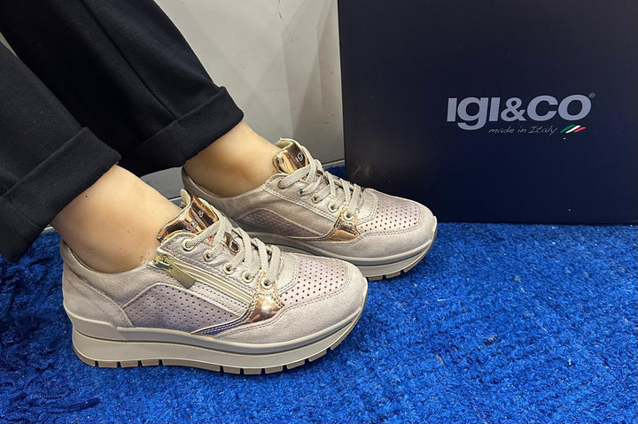 Sneakers donna igi&co in camoscio e pelle laserata beige e nude con inserti lamé platino. Chiusura con lacci piatti in cotone in tinta e zip sul laterale esterno, linguetta logata. Sottopiede memory foam in pelle, fondo in gomma altezza 4 cm.