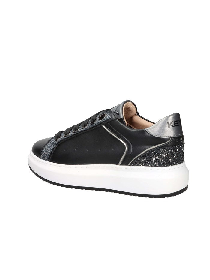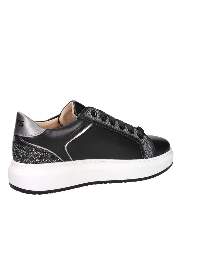 Sneakers donna Keys in similpelle nera con inserto animalier e talloniera glitterata. Tomaia interna e plantare removibile in pelle. Chiusura con lacci piatti in cotone in tinta con placchetta logata passalacci. Linguetta e talloniera logate a contrasto. Fondo gomma altezza 4.5 cm