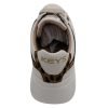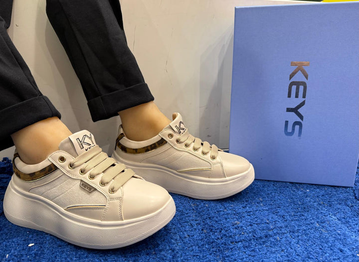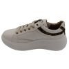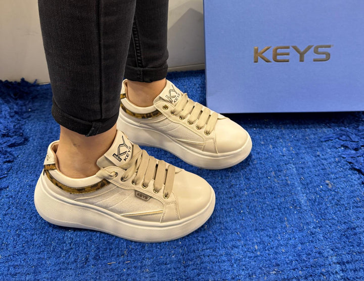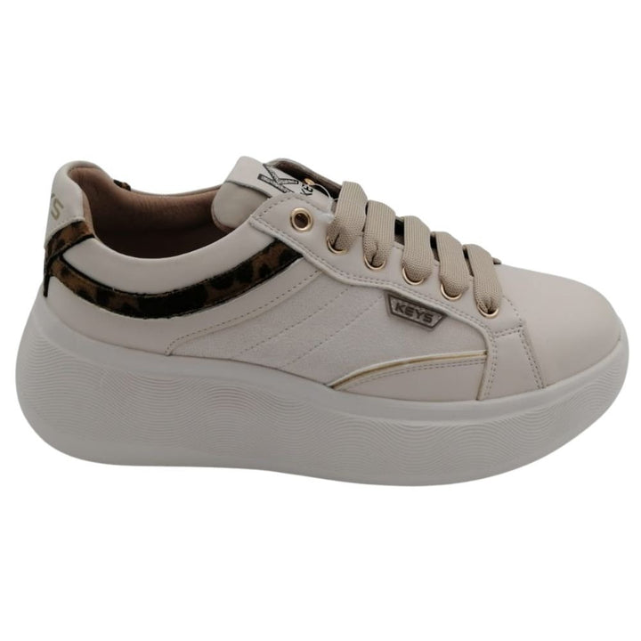 Sneakers donna Keys in similpelle crema e ecocamoscio beige con inserto leopard a contrasto. Tomaia interna e plantare removibile in pelle. Chiusura con lacci piatti in cotone in tinta, linguetta logata e calza facile posteriore logato. Fondo gomma ultra light altezza 5.5 cm