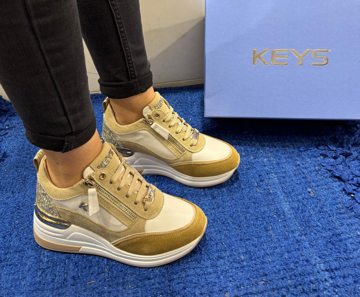 Sneakers donna Keys in pelle bianca e ecocamoscio beige/camel. Tomaia interna e plantare removibile in pelle. Chiusura con lacci piatti in cotone in tinta e doppie zip laterali. Placchetta logo passa lacci, linguetta logata e talloniera con glitter a contrasto argento. Fondo zeppa in gomma altezza 6 cm, spoiler posteriore cromato oro con logo.