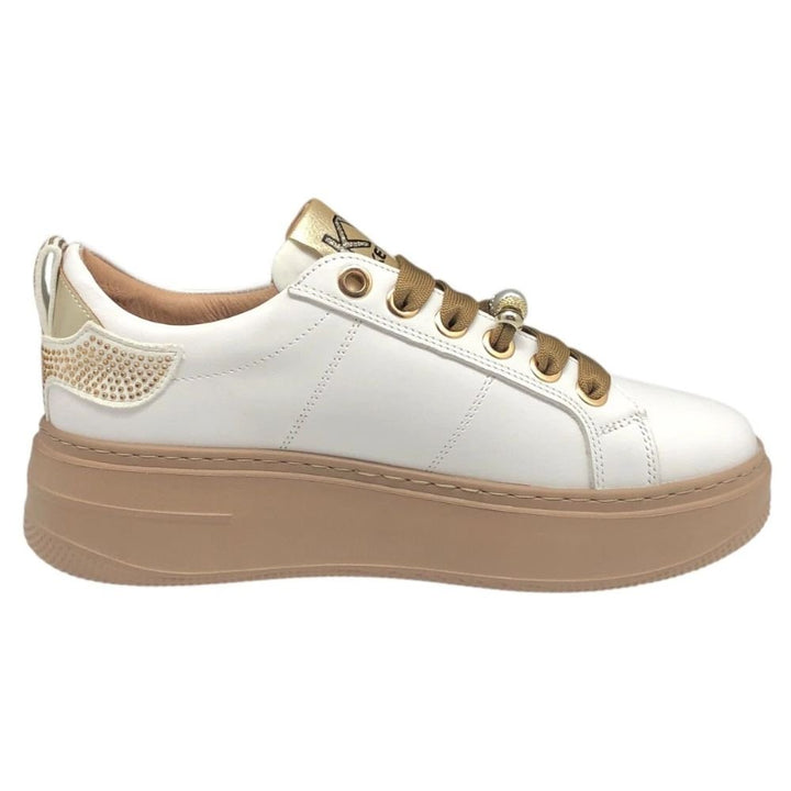Sneakers donna Keys in pelle bianca con inserti platino. Tomaia interna e plantare removibile in pelle. Chiusura con lacci piatti in cotone color corda, impreziositi da charms passalacci, e zip sul laterale esterno. Linguetta logata e calza facile posteriore logato con strass. Placchetta logo metallica sul laterale, fondo gomma a contrasto altezza 5.5 cm