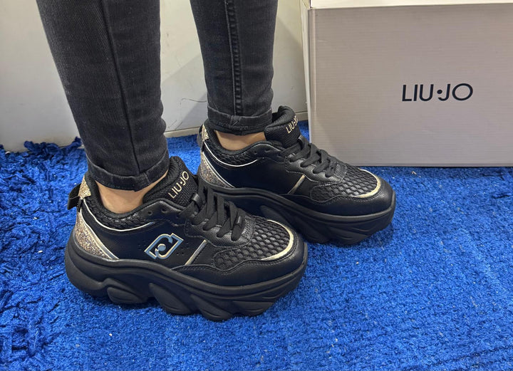 Sneakers donna Liu Jo in pelle bottolata nera con inserti rete e dettagli metallizzati. Chiusura con lacci piatti in cotone in tinta e linguetta con logo stampato. Logo monogram laterale metallico oro, inserto glitter oro sul tallone. Fondo chuncky in Eva altezza 6 cm.