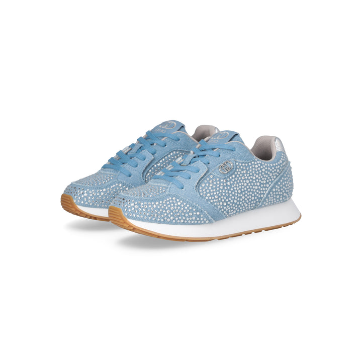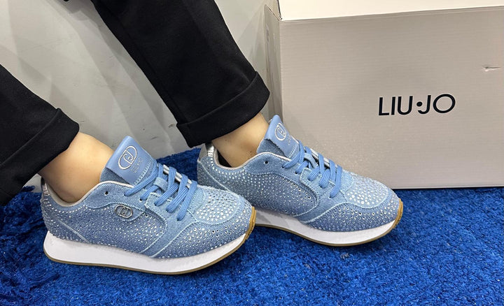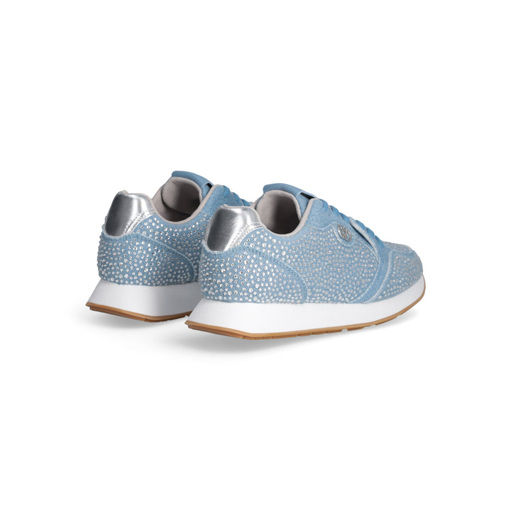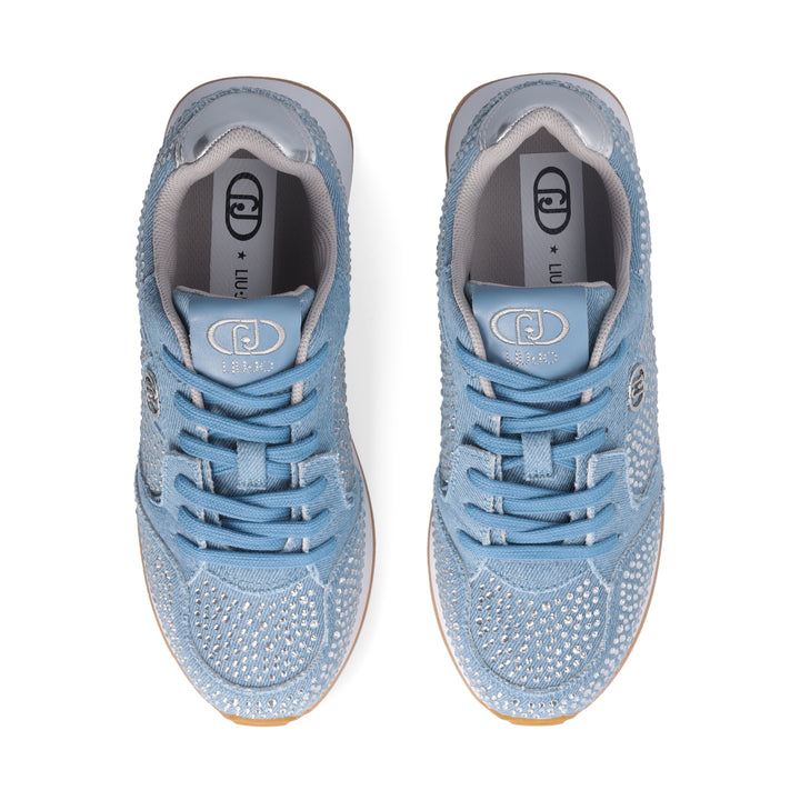Sneakers donna Liu Jo in denim ricoperta di strass luccicanti. Chiusura con lacci piatti in cotone, patch logo sulla linguetta e riporto lamé silver sulla talloniera. Fondo gomma altezza 3 cm, battistrada dentellato.