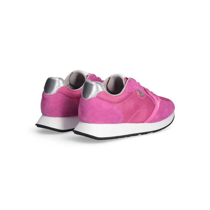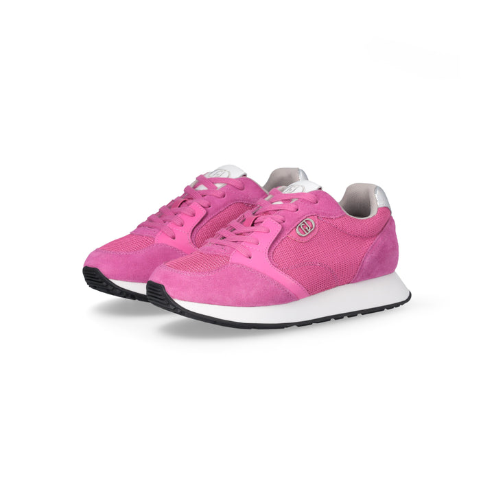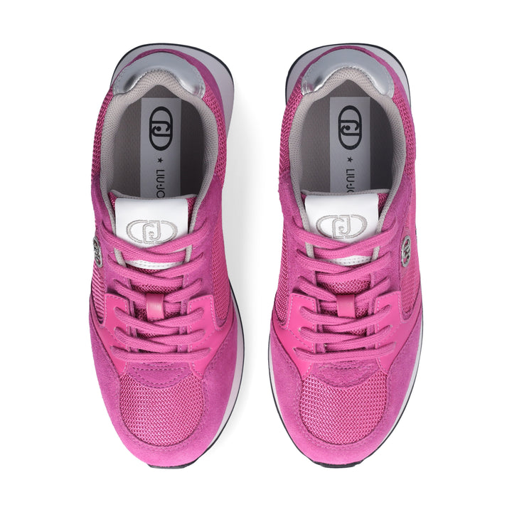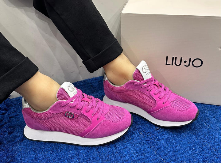 Sneakers donna Liu Jo fuxia in camoscio e tessuto a rete glitterato. Chiusura con lacci piatti in cotone, patch logo ricamato sulla linguetta e riporto lamé silver sulla talloniera. Fondo gomma altezza 3 cm, battistrada dentellato.