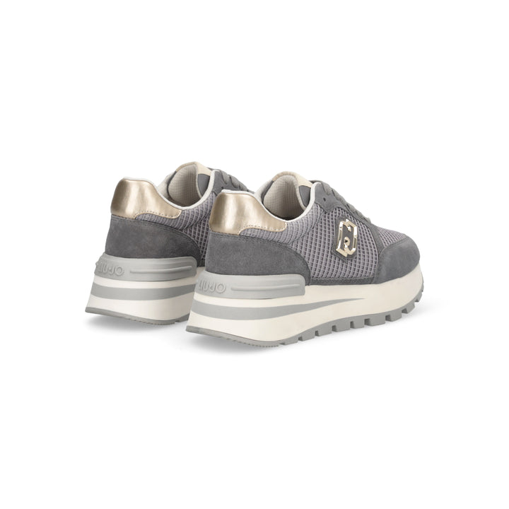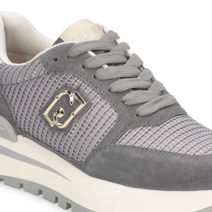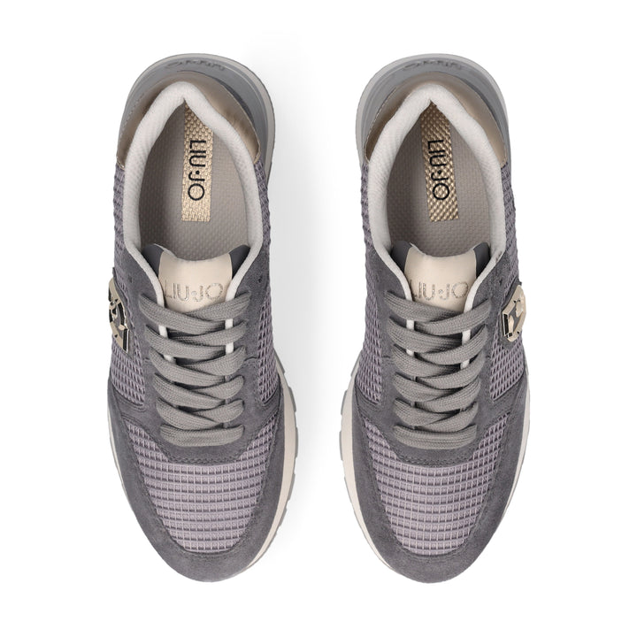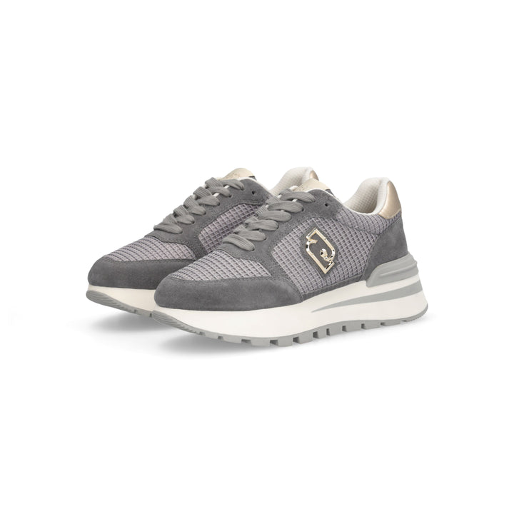 Sneakers donna Liu Jo grigio antracite in camoscio e mesh con dettaglio rete, chiusura con lacci piatti in cotone in tinta. Logo monogram laterale metallico oro, inserto laminato sul tallone e spoiler posteriore logato. Fondo gomma platform altezza 5 cm e battistrada dentellato.