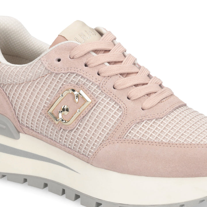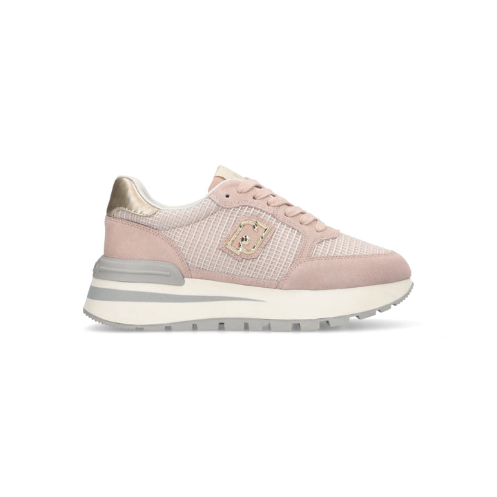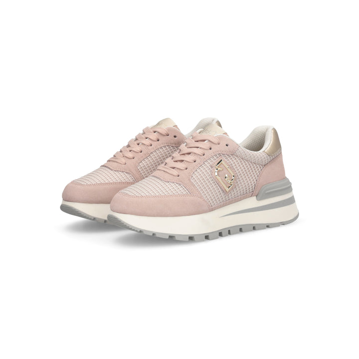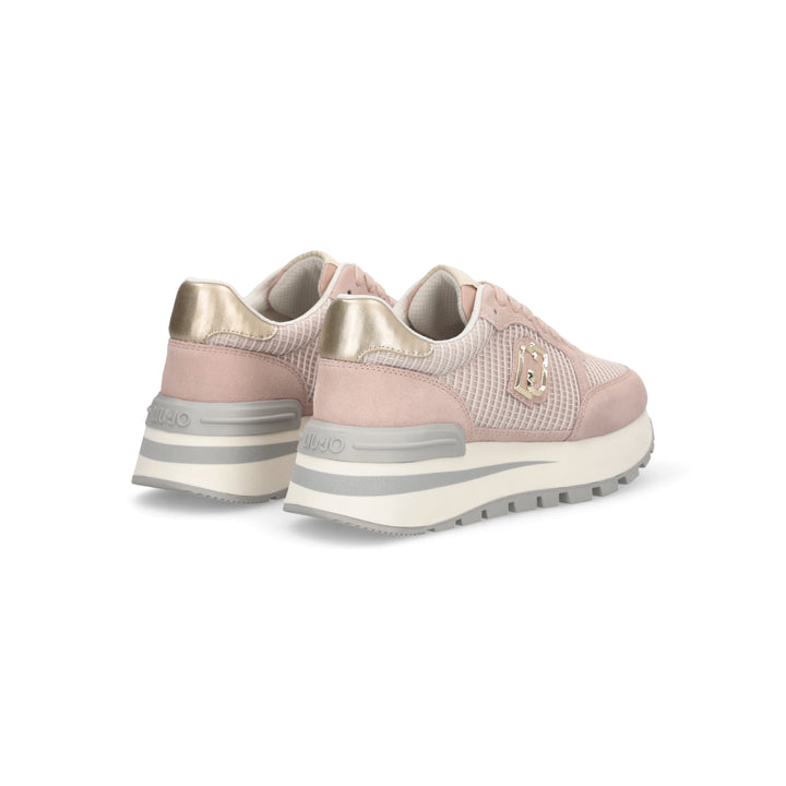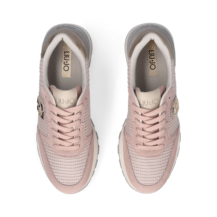 Sneakers donna Liu Jo nude in camoscio e mesh con dettaglio rete, chiusura con lacci piatti in cotone in tinta. Logo monogram laterale metallico oro, inserto laminato sul tallone e spoiler posteriore logato. Fondo gomma platform altezza 5 cm e battistrada dentellato.