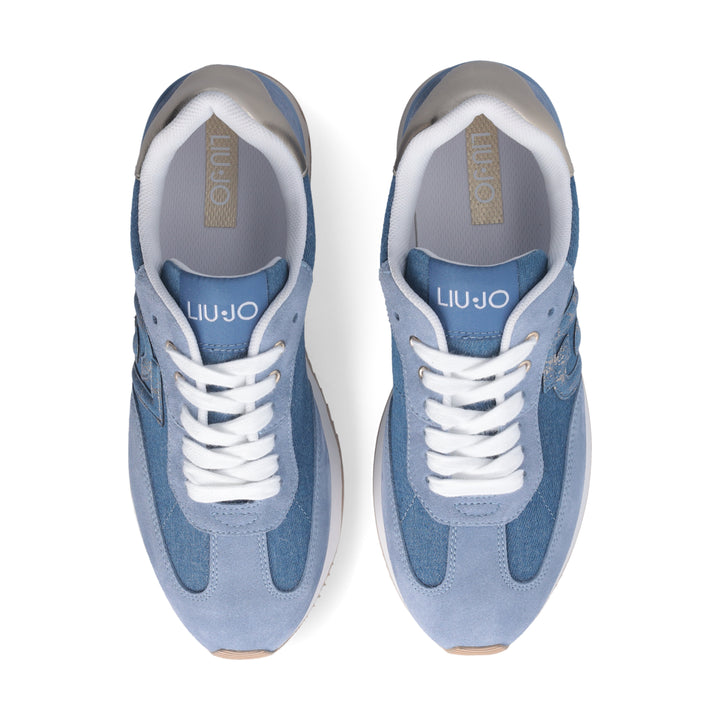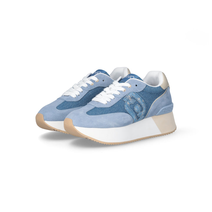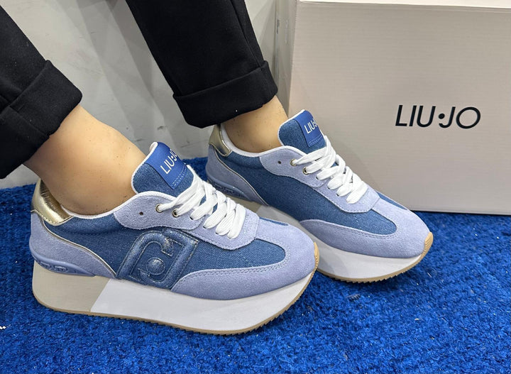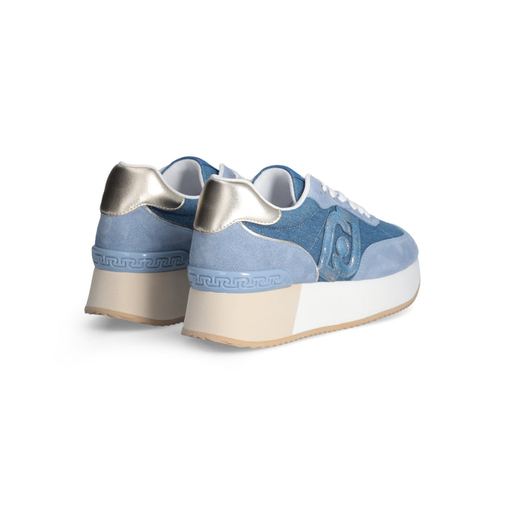 Sneakers donna Liu Jo in jeans e camoscio azzurro con dettagli laminati oro, patch logo laterale bold effetto glossy. Chiusura con lacci piatti in cotone, fodera interna effetto spugna. Spoiler posteriore con dettaglio monogram "LJ". Suola platform bicolor, fondo gomma altezza 5 cm, battistrada dentellato.