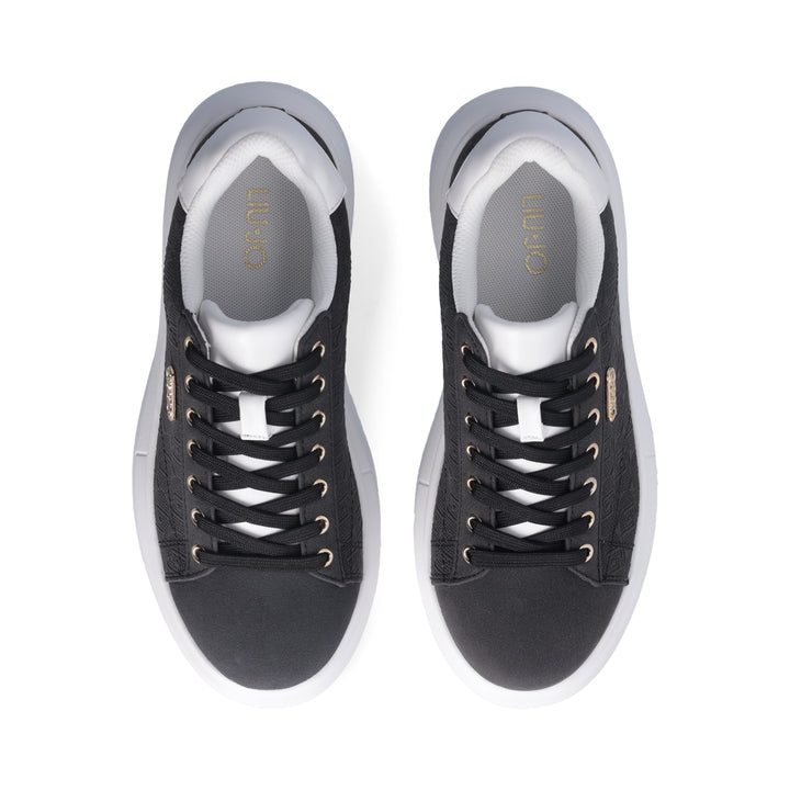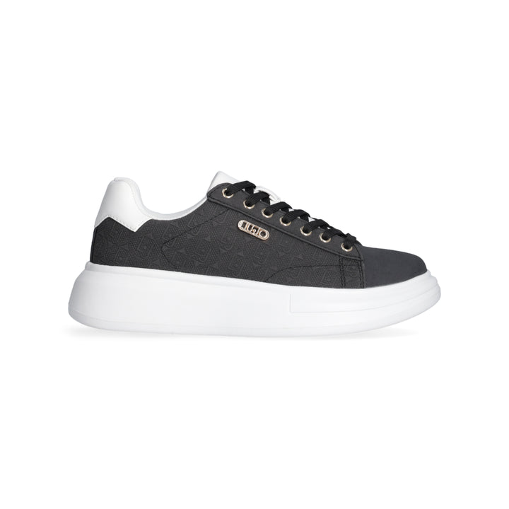 Sneakers donna Liu Jo in ecopelle con stampa monogram all over. Chiusura con lacci piatti in cotone in tinta, mini logo laterale gold. Sottopiede estraibile in memory foam. Fondo gomma bold altezza 4.5 cm