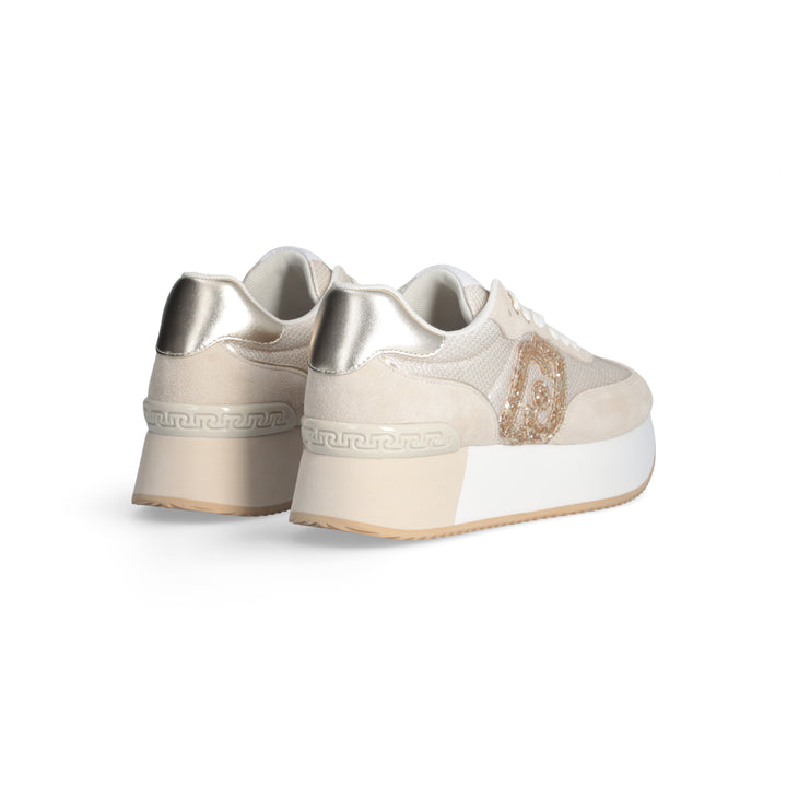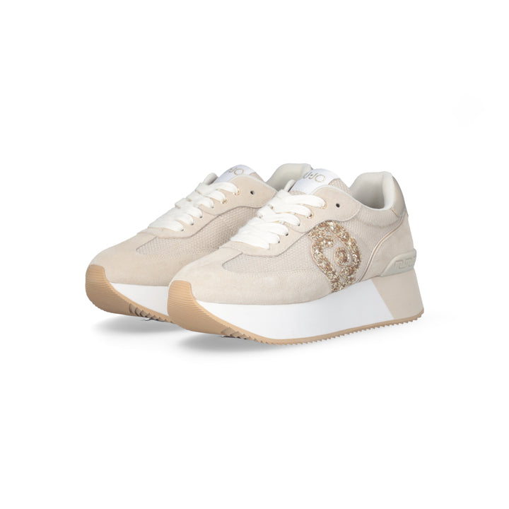 Sneakers donna Liu Jo in camoscio e bright mesh beige con dettagli laminati oro, patch logo laterale full glitter. Chiusura con lacci piatti in cotone, fodera interna effetto spugna. Spoiler posteriore con dettaglio monogram "LJ". Suola platform bicolor, fondo gomma altezza 5 cm, battistrada dentellato.