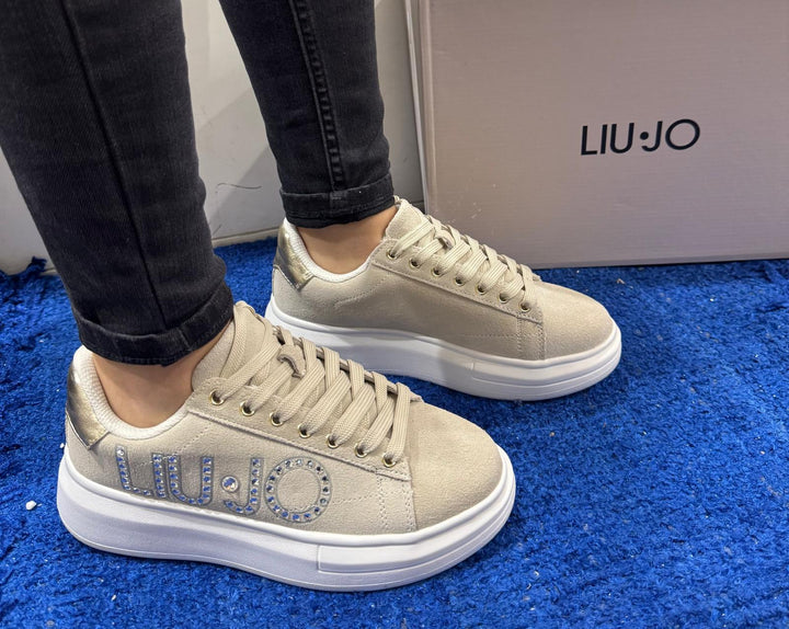 Sneakers donna Liu Jo in camoscio color corda e dettagli oro. Maxi logo gioiello sul laterale, inserto lamé gold sulla talloniera. Chiusura con lacci piatti in cotone in tinta, sottopiede estraibile in comfort foam. Fondo gomma bold altezza 5.5 cm