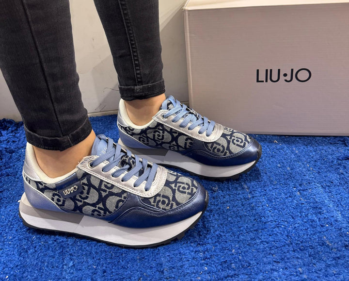 Sneakers donna Liu Jo in tessuto denim con logo monogram jacquard ed ecopelle blue, con inserti silver. Chiusura con lacci piatti in cotone in tinta, patch con logo lettering, etichetta con logo jacquard. Sottopiede estraibile in comfort foam, fondo eva ultra light bicolor con battistrada dentellato a contrasto altezza 4 cm.ย