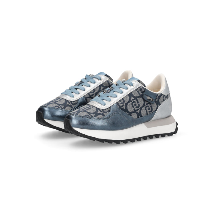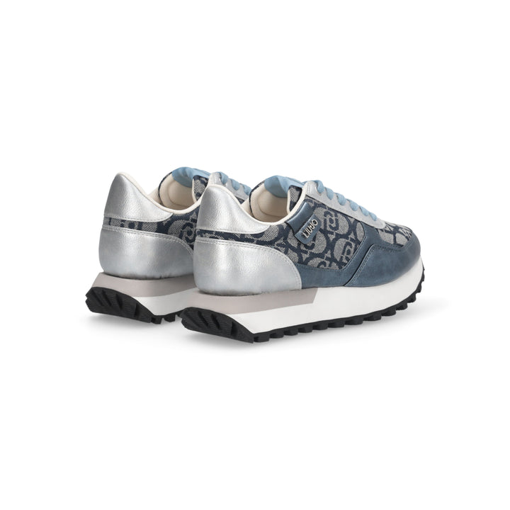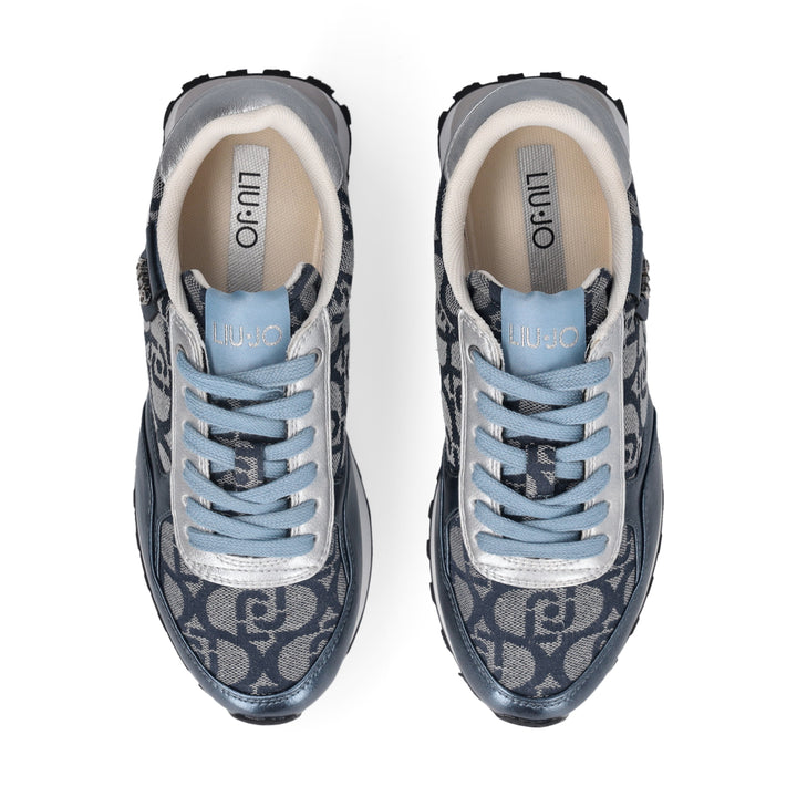 Sneakers donna Liu Jo in tessuto denim con logo monogram jacquard ed ecopelle blue, con inserti silver. Chiusura con lacci piatti in cotone in tinta, patch con logo lettering, etichetta con logo jacquard. Sottopiede estraibile in comfort foam, fondo eva ultra light bicolor con battistrada dentellato a contrasto altezza 4 cm.