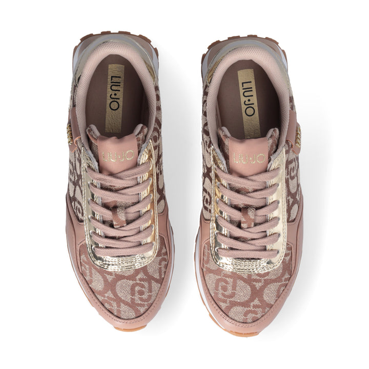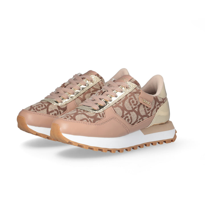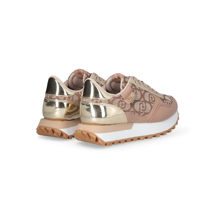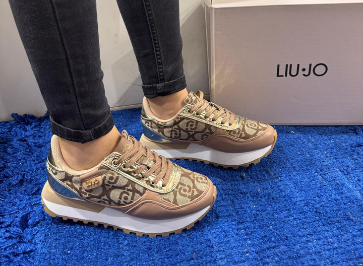Sneakers donna Liu Jo in tessuto beige con logo monogram jacquard ed ecopelle beige, con inserti oro effetto specchio. Chiusura con lacci piatti in cotone in tinta, patch con logo lettering, etichetta con logo jacquard. Sottopiede estraibile in comfort foam, fondo eva ultra light bicolor con battistrada dentellato a contrasto altezza 4 cm.