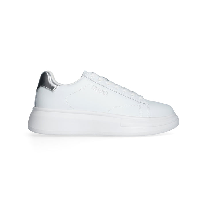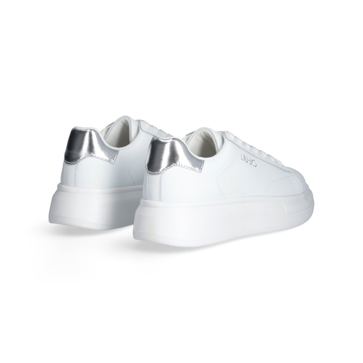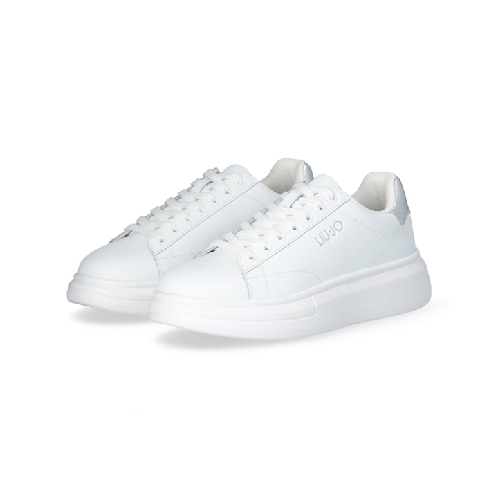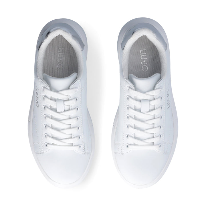 Sneakers donna Liu Jo in pelle liscia total white con inserti lamé silver. Chiusura con lacci piatti in cotone in tinta, logo laterale silver. Sottopiede estraibile in memory foam. Fondo gomma bold altezza 4.5 cm