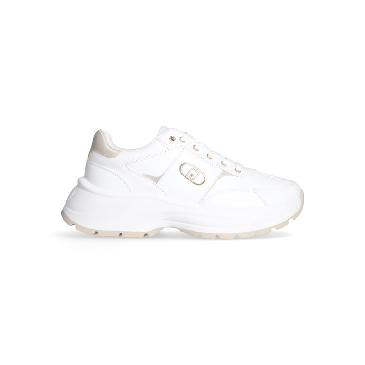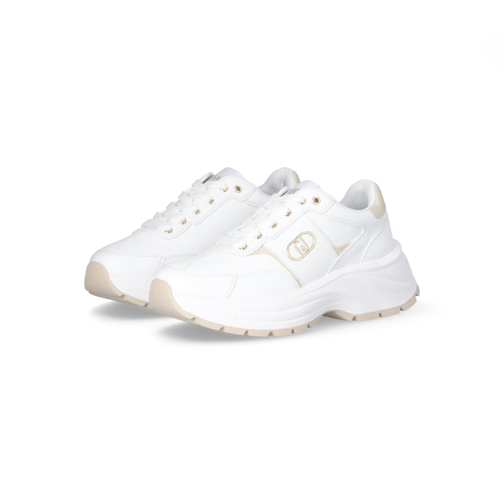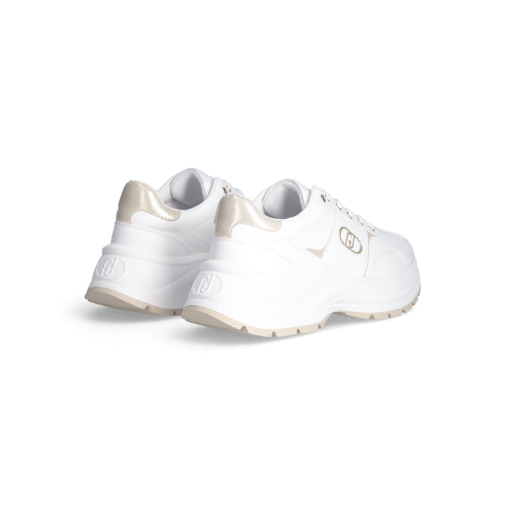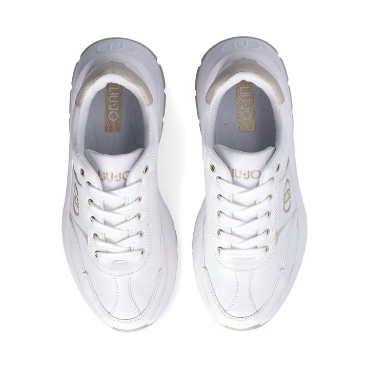 Sneakers donna Liu Jo in pelle bianca con dettagli laminati, chiusura con lacci piatti in cotone in tinta. Logo monogram "LJ" effetto lamé e placchetta metallica logo gold laterale. Suola bold con logo monogram sul tallone, fondo 6 cm e battistrada dentellato.