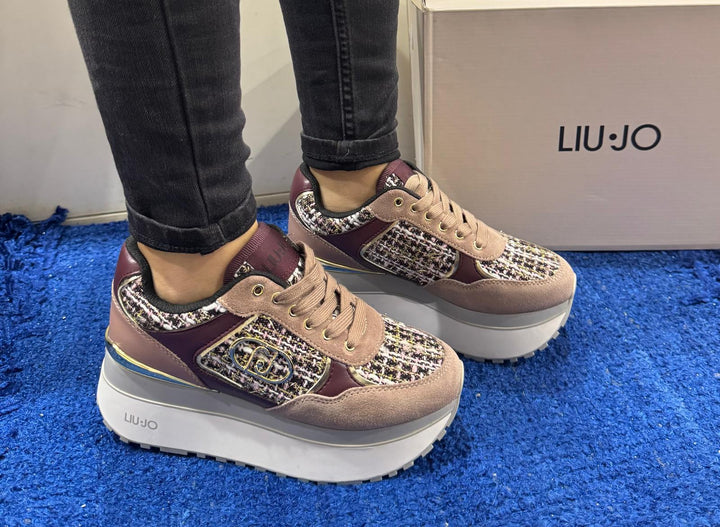 Sneakers donna Liu Jo in pelle rosa antico e camoscio rosa cipria con inserti in tessuto e filato in tinta e dattagli oro effetto laminato. Logo monogram metallico oro sul laterale. Chiusura con lacci piatti in cotone, etichetta con logo jacquard. Spoiler posteriore cromato oro, suola super platform con design multistrato logato. Fondo gomma altezza 6 cm, battistrada dentellato.
