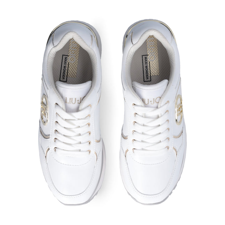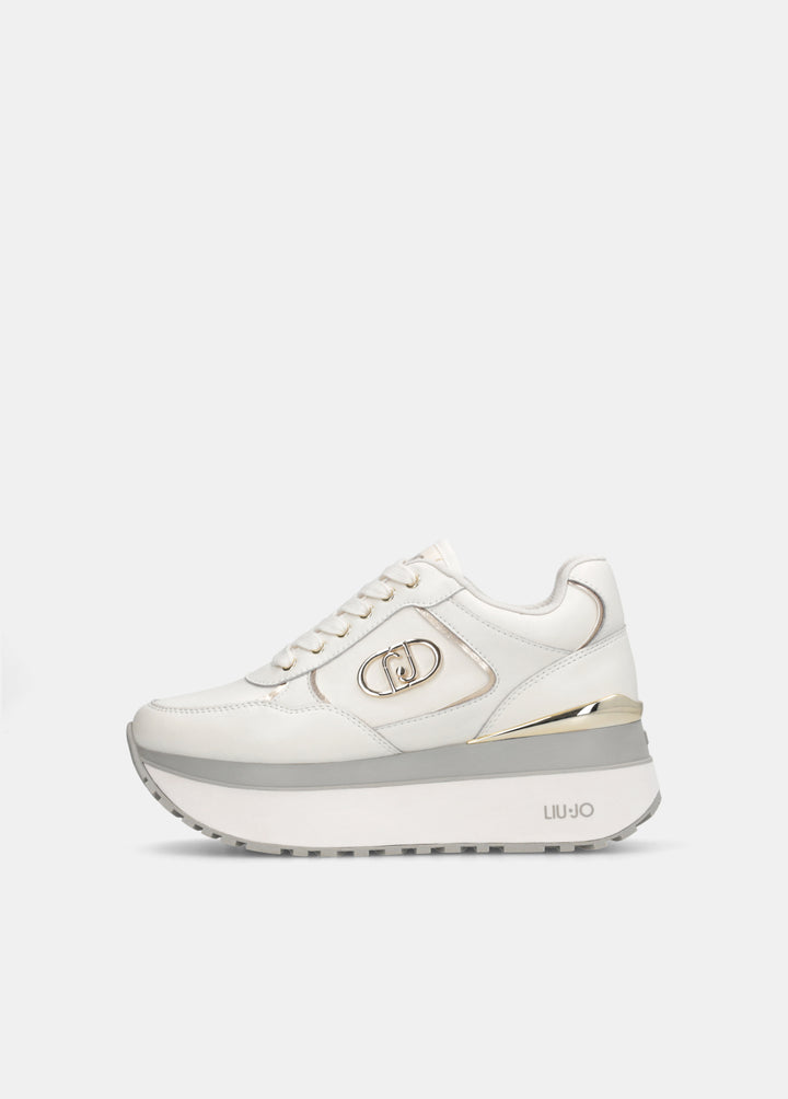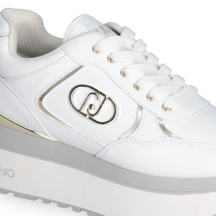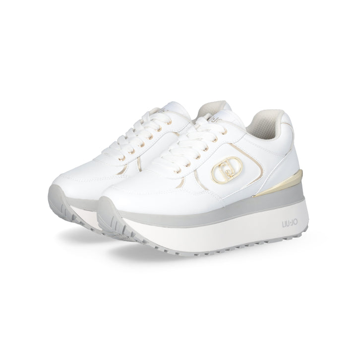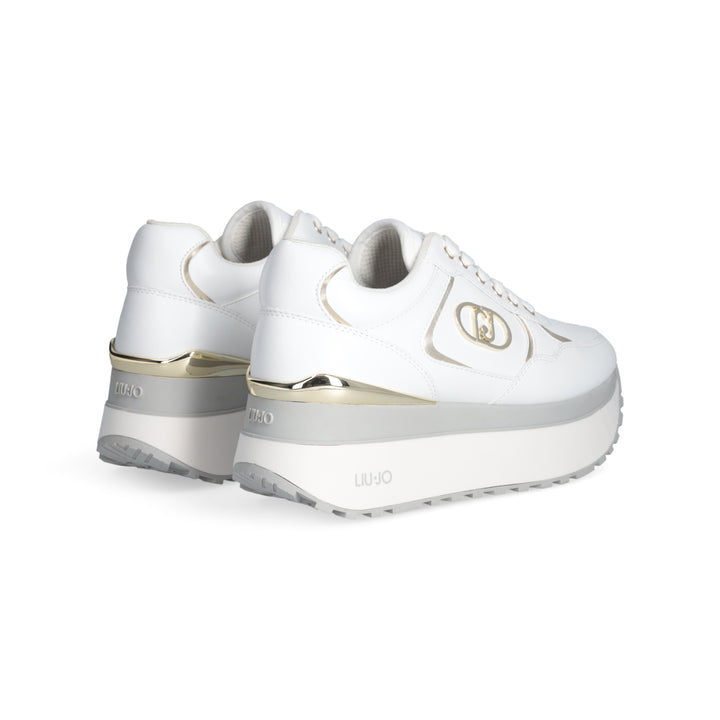 Sneakers donna Liu Jo in pelle bianca con dettagli oro e inserti effetto laminato. Logo monogram metallico oro sul laterale. Chiusura con lacci piatti in cotone, etichetta con logo jacquard. Spoiler posteriore cromato oro, suola super platform con design multistrato logato. Fondo gomma altezza 6 cm, battistrada dentellato.