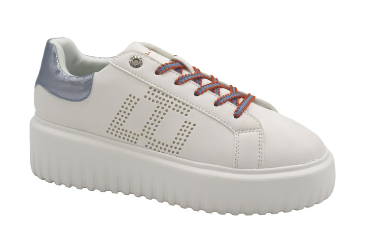 Sneakers donna platform Love to Love Gai Mattiolo in ecopelle total white con dettagli bluette lurex. Logo laterale laserato, linguetta e talloniera logate. Chiusura con lacci piatti in cotone in contrasto, fondo zigrinato ultra light altezza 5 cm.
