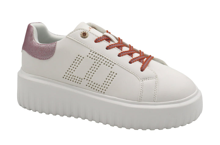 Sneakers donna platform Love to Love Gai Mattiolo in ecopelle total white con dettagli pink lurex. Logo laterale laserato, linguetta e talloniera logate. Chiusura con lacci piatti in cotone in contrasto, fondo zigrinato ultra light altezza 5 cm.