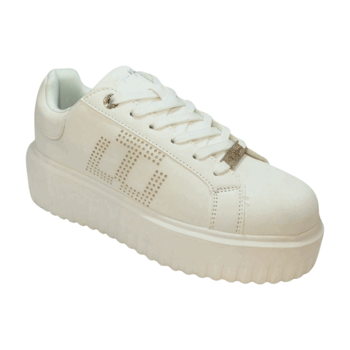 Sneakers donna platform Love to Love Gai Mattiolo in ecopelle total white. Logo laterale laserato, linguetta e talloniera logate. Chiusura con lacci piatti in cotone, fondo zigrinato ultra light altezza 5 cm.