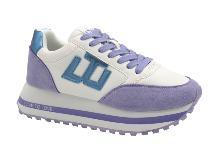 Sneakers donna platform Love to Love Gai Mattiolo in tessuto tecnico bianco e tessuto scamosciato lilla con dettagli lamé bluette. Logo laterale a rilievo, linguetta e talloniera logate. Chiusura con lacci piatti in cotone a contrasto, fondo bicolor logato altezza 5 cm.