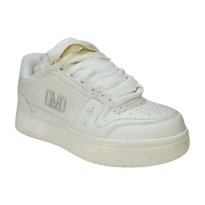 Sneakers donna Marc Ellis in ecopelle total white con punta laserata. Placchetta logo metallica in tinta sul laterale e applicazione stelline metalliche. Linguetta e talloniera logate, chiusura con maxi lacci in cotone disponibili in due varianti colore. Sottopiede in memory foam, fondo in gomma altezza 3.5 cm