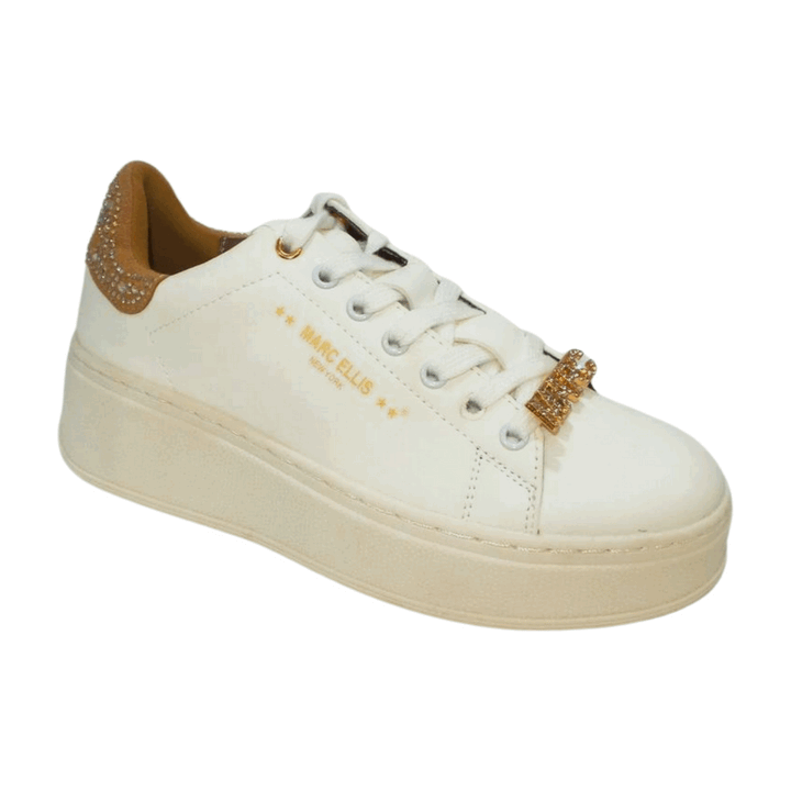 Sneakers donna Marc Ellis in ecopelle bianca con logo laterale beige stampato. Placchetta logo passalacci metallica beige con strass, talloniera in ecocamoscio beige logata ricoperta di strass in tinta. Chiusura con lacci in cotone, sottopiede morbido. Fondo in gomma altezza 5 cm