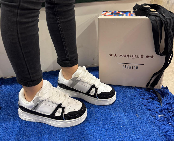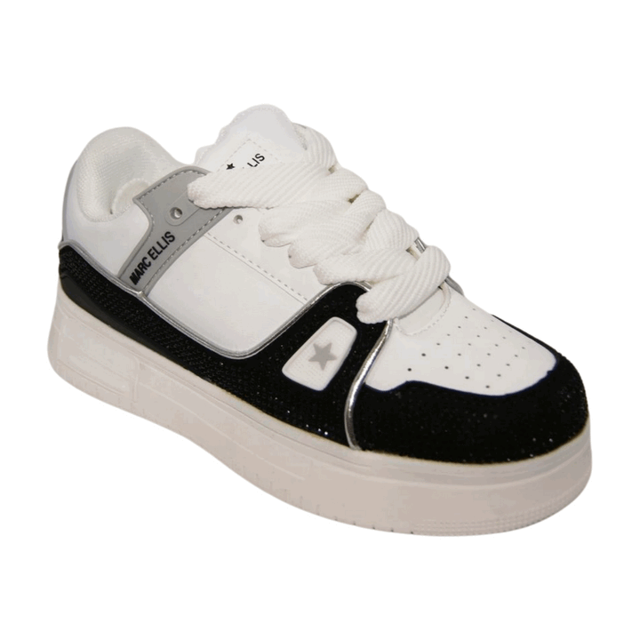 Sneakers donna Marc Ellis in ecopelle white con punta laserata. Inserto ecocamoscio glitterato nero e dettagli gommati con logo grey. Linguetta e talloniera logate, chiusura con maxi lacci in cotone disponibili in due varianti colore. Sottopiede in memory foam, fondo in gomma altezza 4 cm.