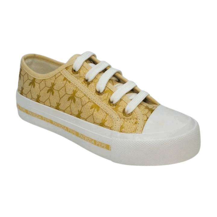 Sneakers donna Patrizia Pepe in tela rinforzata beige logata gold effetto lurex. Punta gommata, chiusura con lacci piatti in cotone. Sottopiede comfort foam, fondo in gomma logato bicolor altezza 4 cm.