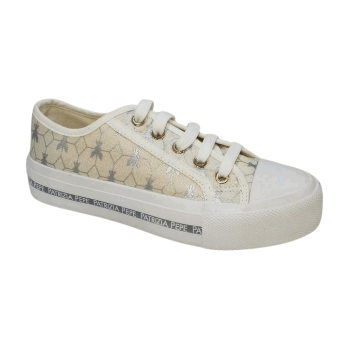 Sneakers donna Patrizia Pepe in tela rinforzata bianca logata silver effetto lurex. Punta gommata, chiusura con lacci piatti in cotone. Sottopiede comfort foam, fondo in gomma logato bicolor altezza 4 cm.