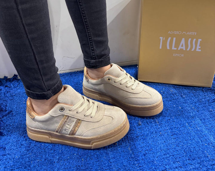 Sneakers donna platform Alviero Martini 1ᴬ Classe in ecopelle scamosciata beige e inserti geo beige. Tomaia interna e plantare removibile in pelle comfort foam, logo laterale con applicazione strass. Chiusura con lacci piatti in cotone in tinta, fondo sport in gomma altezza 3 cm.