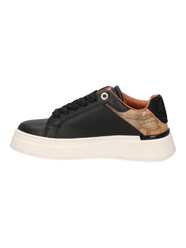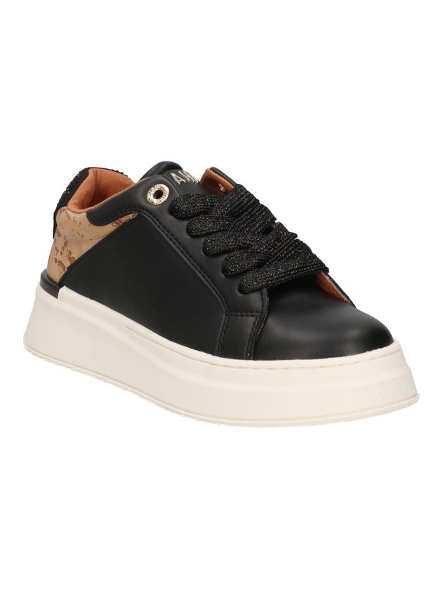 Sneakers donna platform Alviero Martini 1ᴬ Classe in ecopelle nera e inserti geo beige. Tomaia interna e plantare removibile in pelle comfort foam. Spoiler posteriore cromato nero, chiusura con lacci piatti lurex in tinta e strass sulla talloniera. Fondo a cassetta in gomma altezza 4 cm.