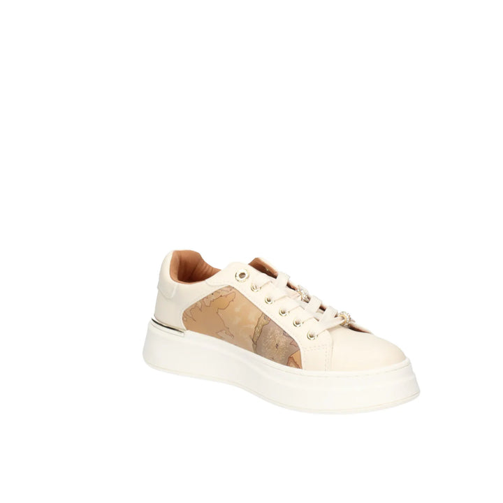 Sneakers donna platform Alviero Martini 1ᴬ Classe in ecopelle bottolata bianco sporco e inserti geo beige. Tomaia interna e plantare removibile in pelle comfort foam. Spoiler posteriore cromato oro, chiusura con lacci piatti in cotone in tinta con applicazione charms passalacci removibili. Fondo a cassetta in gomma altezza 4 cm.