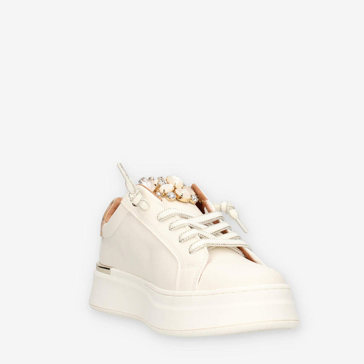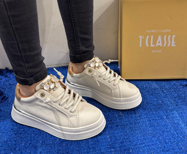 Sneakers donna platform Alviero Martini 1ᴬ Classe in ecopelle bianco sporco e inserti geo beige. Tomaia interna e plantare removibile in pelle comfort foam. Spoiler posteriore cromato oro, chiusura con lacci piatti in cotone lurex bicolor. Maxi applicazione gioiello sulla linguetta, fondo a cassetta in gomma altezza 4 cm.