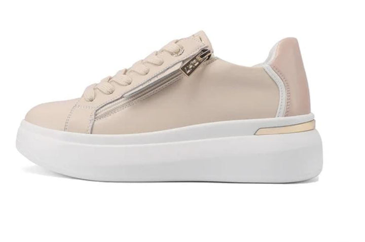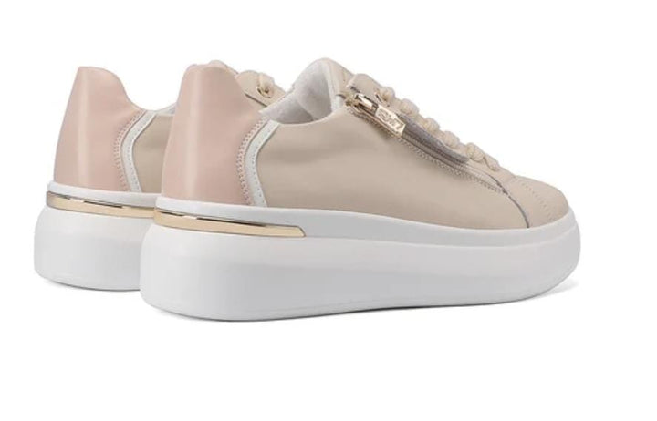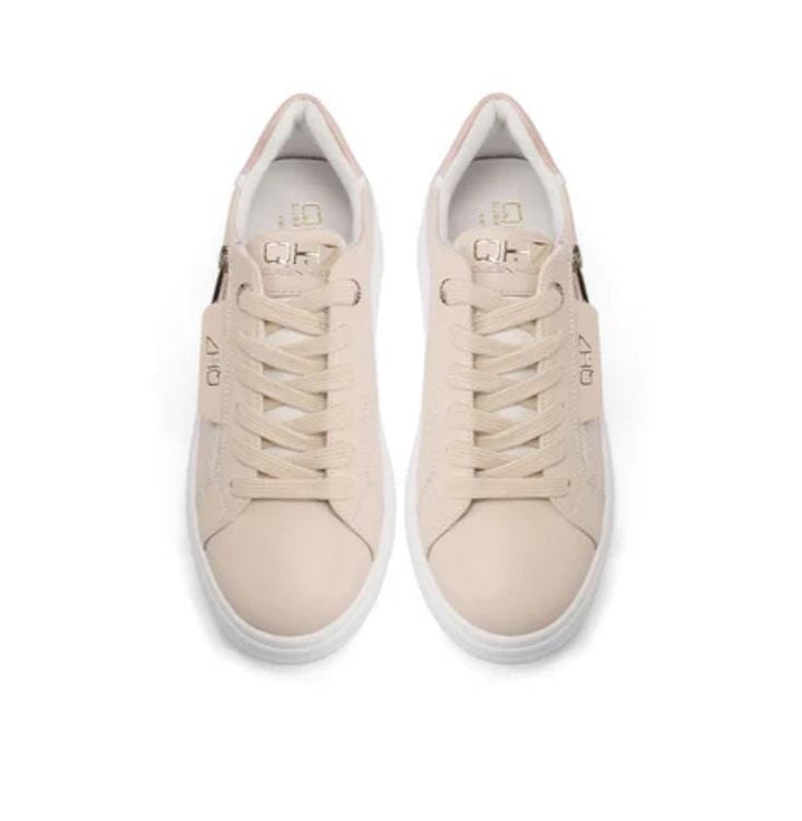 Sneakers donna Queen Helena in pelle beige con dettagli oro e zip funzionante sul laterale esterno. Tomaia interna e plantare removibile in pelle, linguetta logata e talloniera rosa a contrasto. Chiusura con lacci piatti in cotone in tinta, sottopiede comfort foam. Inserto spoiler cromato oro, fondo gomma altezza 5 cm.