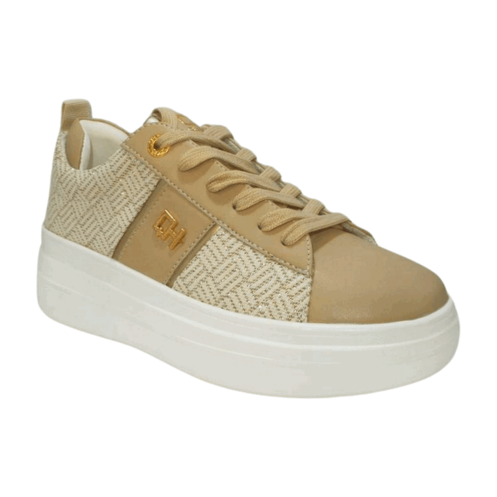 Sneakers donna Queen Helena in pelle beige e tessuto beige/oro. Tomaia interna e plantare removibile in pelle, linguetta logata e calza facile posteriore. Patch laterale con applicazione logo metallico oro, chiusura con lacci piatti in cotone in tinta. Sottopiede comfort foam, fondo gomma altezza 5 cm.