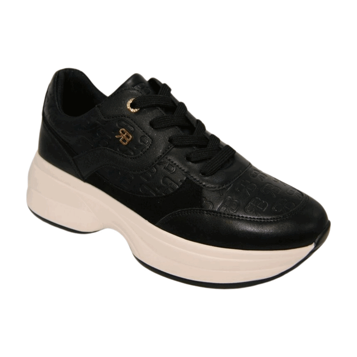 Sneakers donna Renato Balestra in ecopelle total black con stampa monogram in rilievo e inserti in tessuto in tinta. Tomaia interna e plantare removibile in pelle. Chiusura con lacci piatti in cotone in tinta, fondo gomma altezza 5 cm.