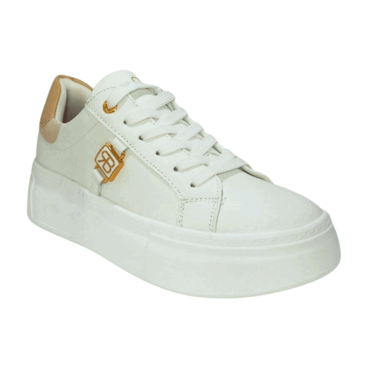 Sneakers donna Renato Balestra in ecopelle bianca, tomaia interna e plantare removibile in pelle. Talloniera a contrasto con dettagli beige. Chiusura con lacci piatti in cotone in tinta, patch placchetta logo metallica smaltata. Sottopiede comfort foam, fondo gomma altezza 4.5 cm.