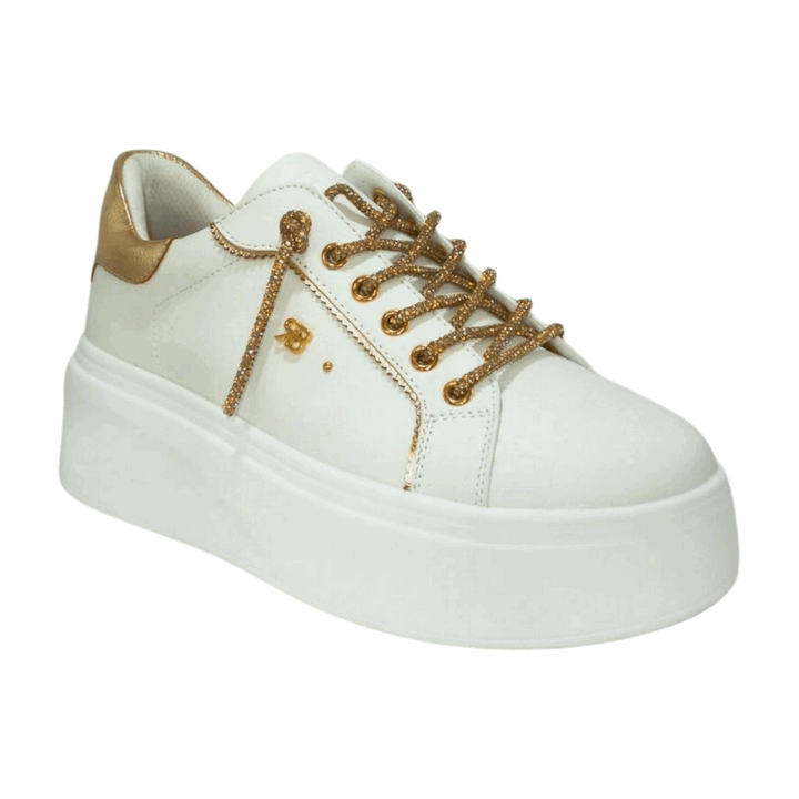 Sneakers donna Renato Balestra in ecopelle bianca con inserti oro. Tomaia interna e plantare removibile in pelle. Talloniera e linguetta a contrasto. Chiusura con lacci gioiello gold e zip sul laterale interno. Sottopiede comfort foam, fondo gomma altezza 6 cm.