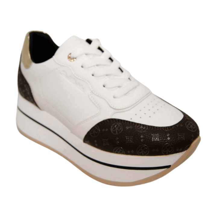 Sneakers donna Renato Balestra in ecopelle bianca e testa di moro con inserto lamé gold e stampa monogram a contrasto. Tomaia interna e plantare removibile in pelle. Chiusura con lacci piatti in cotone in tinta, logo laterale. Sottopiede comfort foam, fondo gomma platform altezza 5.5 cm