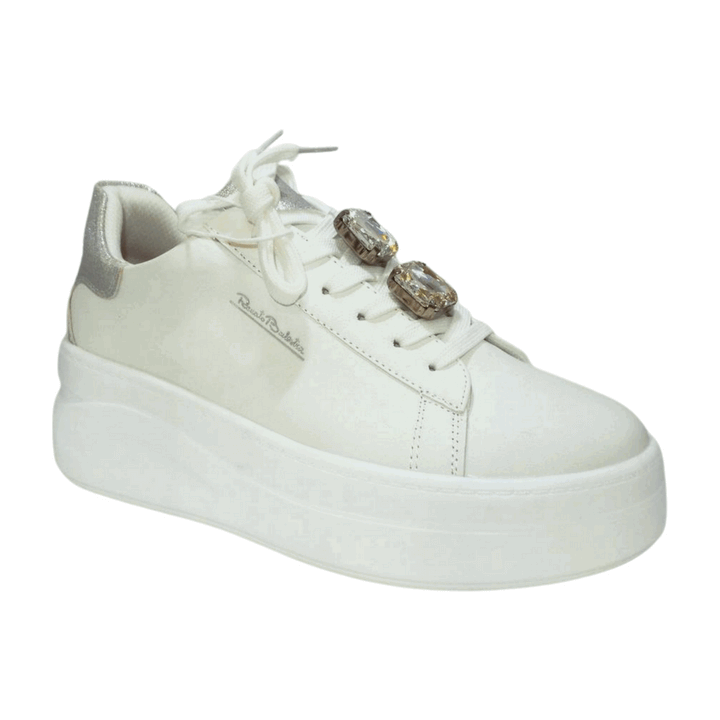 Sneakers donna Renato Balestra in ecopelle bianca con inserti silver. Tomaia interna e plantare removibile in pelle. Talloniera e linguetta a contrasto effetto lame'. Chiusura con lacci piatti in cotone in tinta e applicazioni maxi charm. Sottopiede comfort foam, fondo gomma altezza 6 cm.