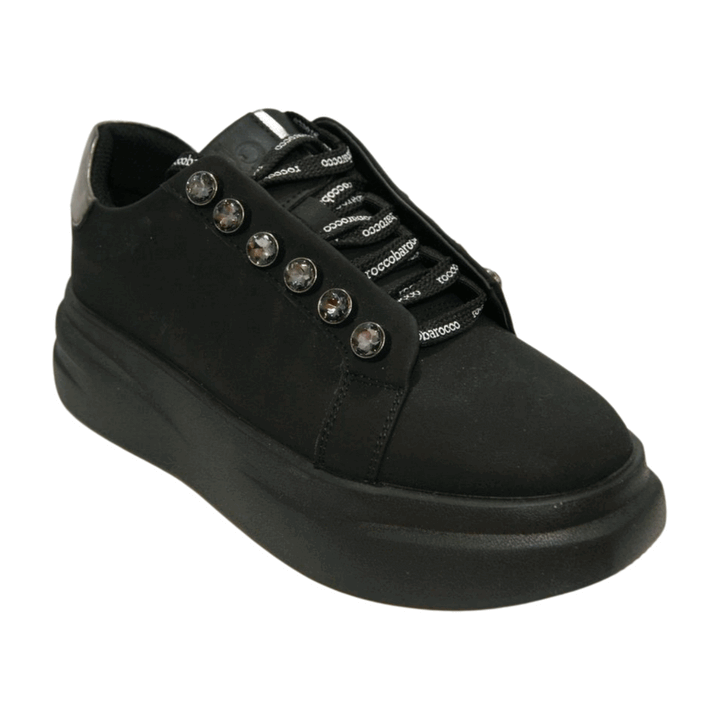 Sneakers donna roccobarocco in pelle nera con inserto talloniera lamé silver. Allacciatura interna con lacci piatti in cotone logati, occhielli gioiello. Plantare in pelle comfort foam, fondo gomma platform altezza 5.5 cm