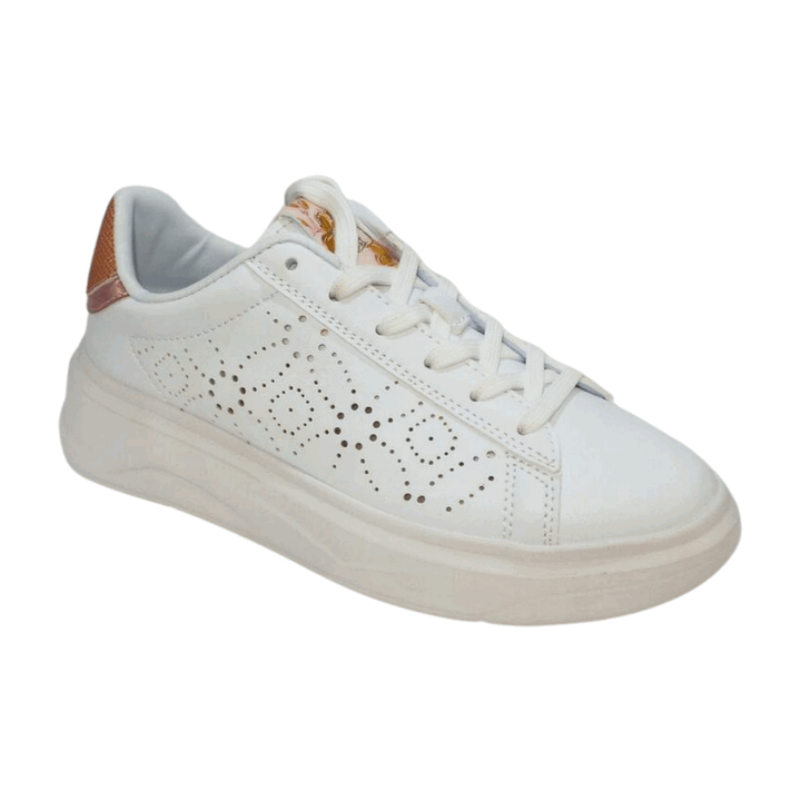 Sneakers donna Solo Soprani Couture in ecopelle traforata total white con inserto talloniera lamé nude. Chiusura con lacci piatti in cotone in tinta, linguetta a contrasto logata. Sottopiede morbido, fondo in gomma ultra light altezza 4.5 cm