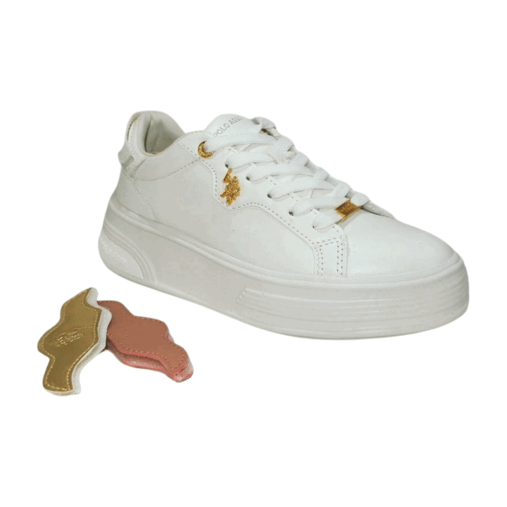 Sneakers donna U.S. Polo Assn. in ecopelle total white con dettagli gold. Chiusura con lacci piatti in cotone in tinta con placchetta passalacci, linguetta e talloniera logate, logo metallico laterale oro. Sottopiede morbido, fondo gomma logata light altezza 4.5 cm