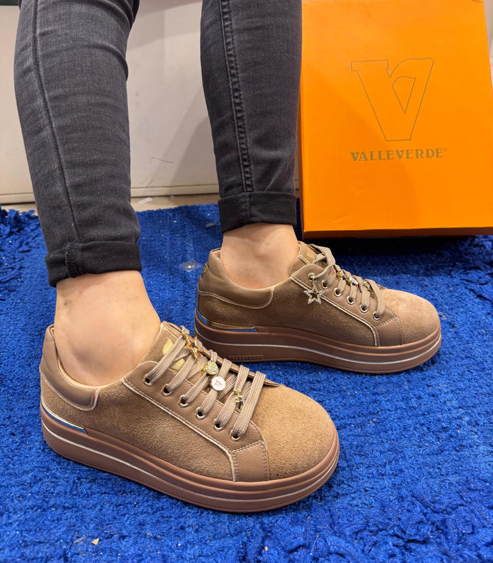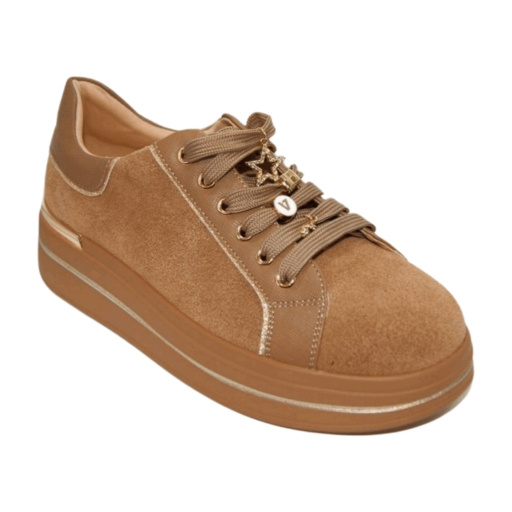 Sneakers donna platform Valleverde in camoscio taupe con inserti glitter oro. Tomaia interna e plantare removibile in pelle. Chiusura con lacci piatti in cotone in tinta con accessori gioiello passalacci removibili. Spoiler posteriore cromato oro, fondo gomma altezza 4.5 cm
